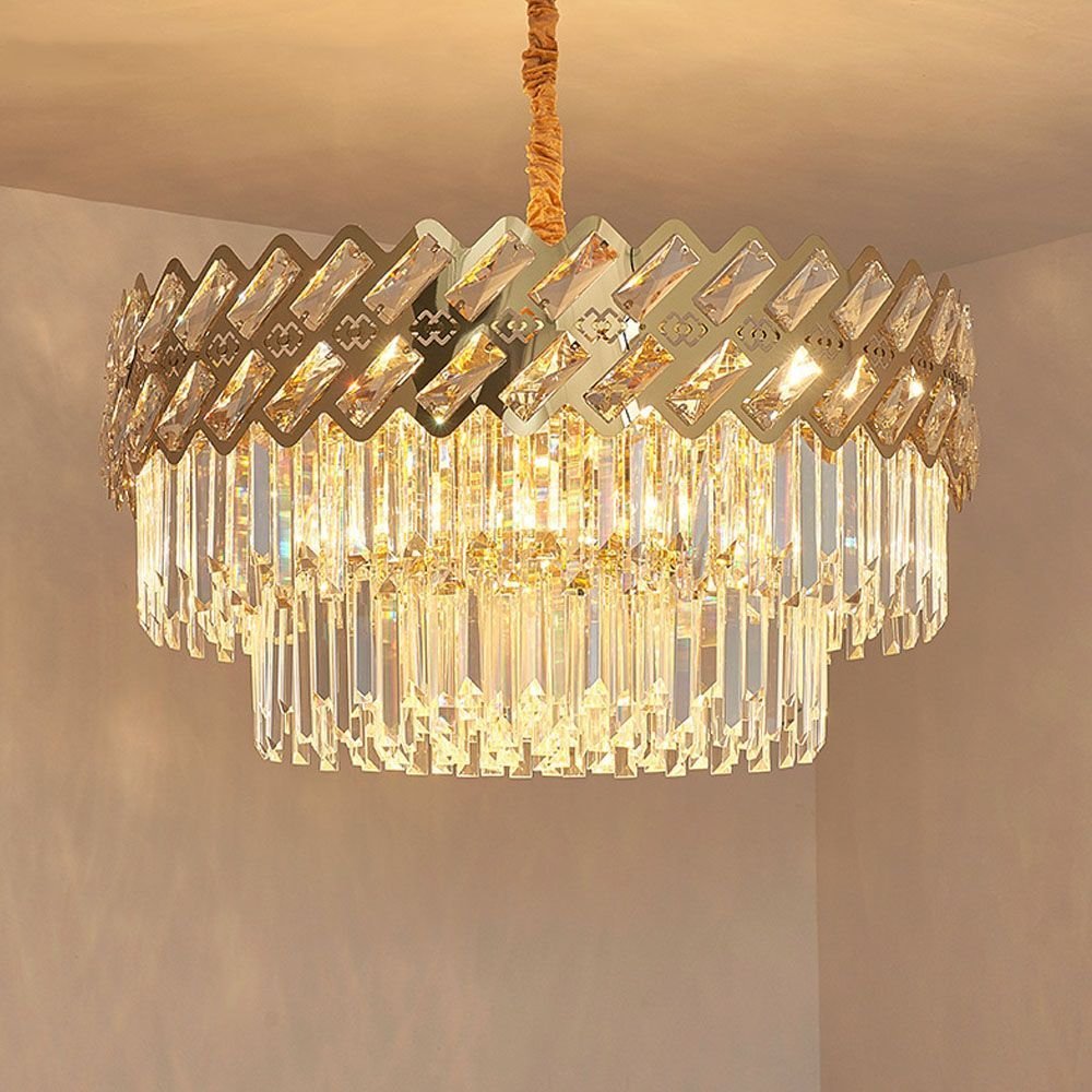 Warm-toned chandelier with amber crystal prisms