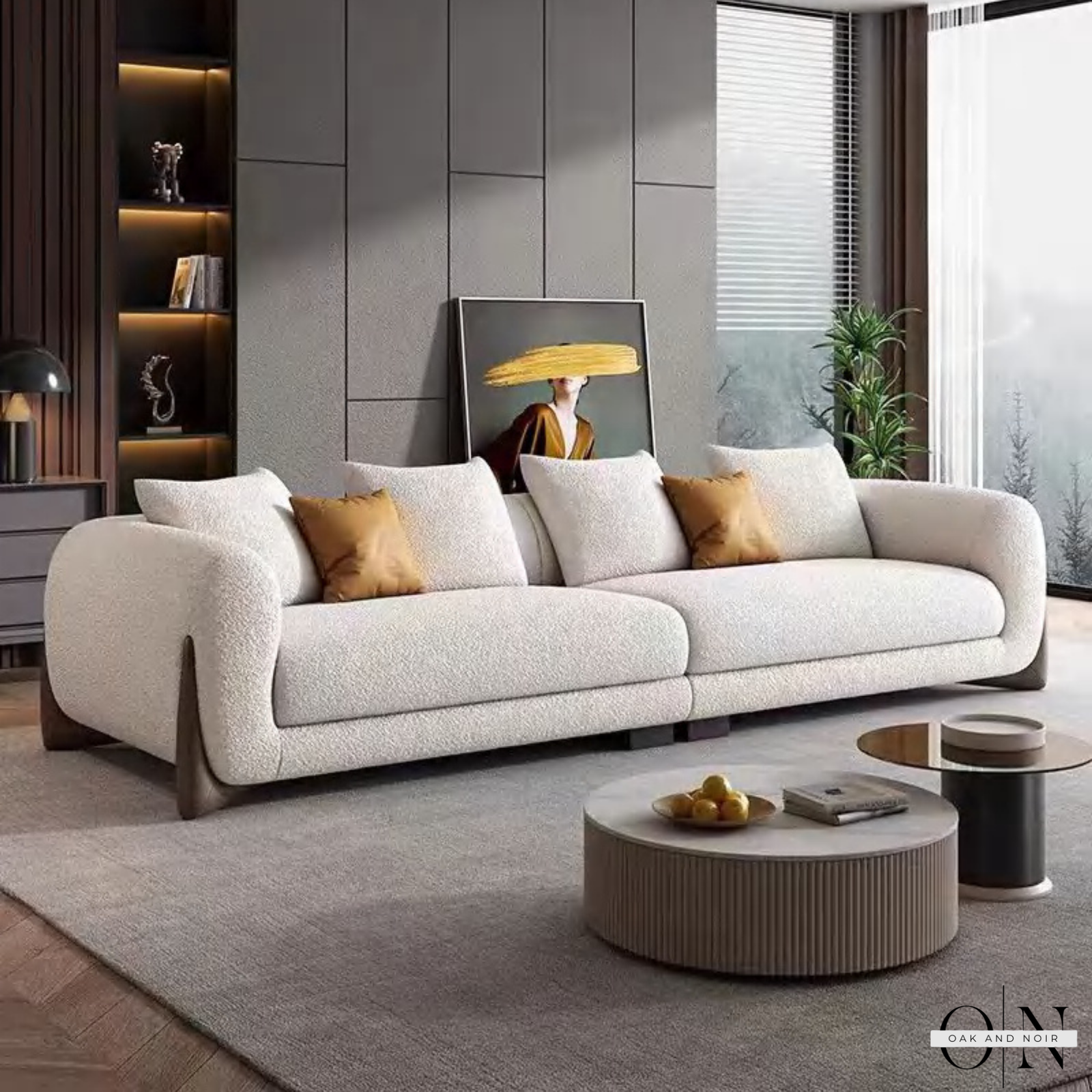 . The softened curves read contemporary while the solid timber wedge legs ground it with warmth
