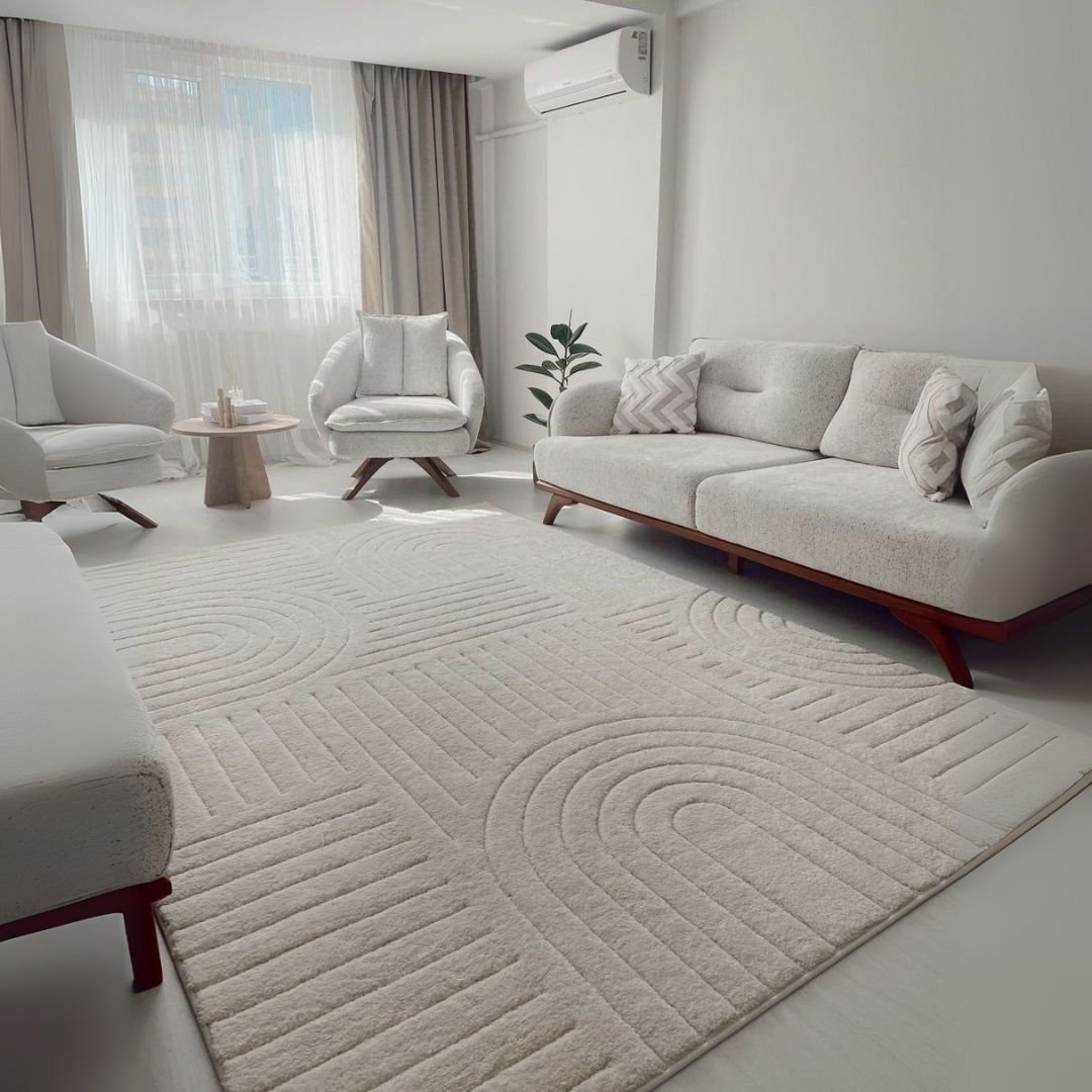 Soft neutral rug with wavy embossed textures, resembling layered clouds
