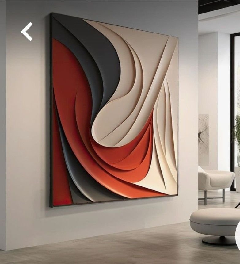 Flowing abstract shapes in red and charcoal tones create a bold, modern centerpiece
