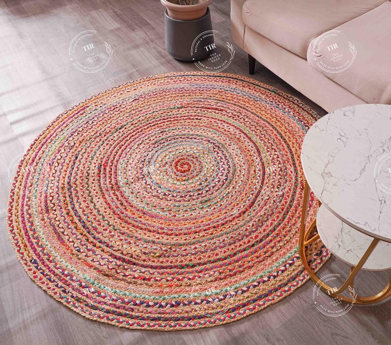Handwoven round rug with a vibrant spiral pattern in shades of orange and red