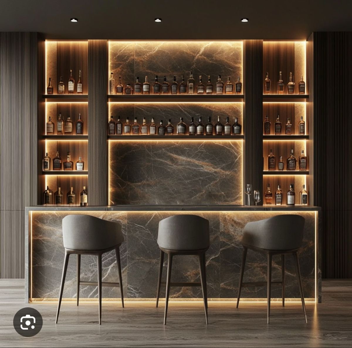 The ultimate luxury dining cabinet with integrated bar shelving, glass-front lighting, and metallic trim