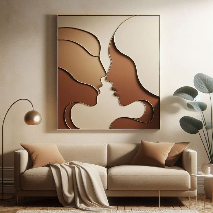 Abstract female form basking in sunset tones, enhanced with soft curves and minimalist plants